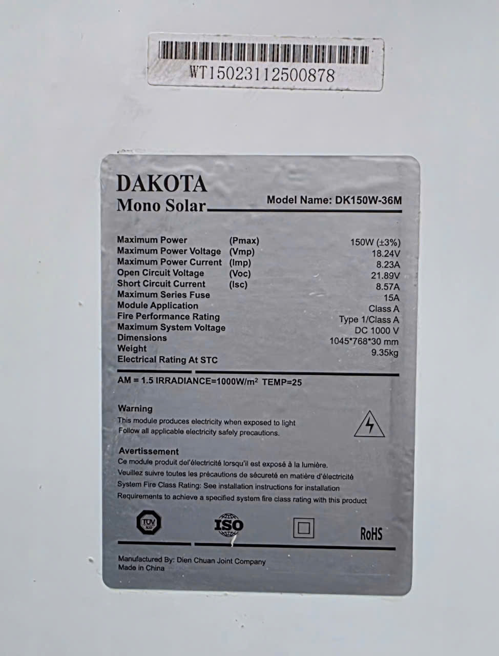 Hình ảnh Tấm pin năng lượng mặt trời mặt trời 150W Dakota DK150W-36M