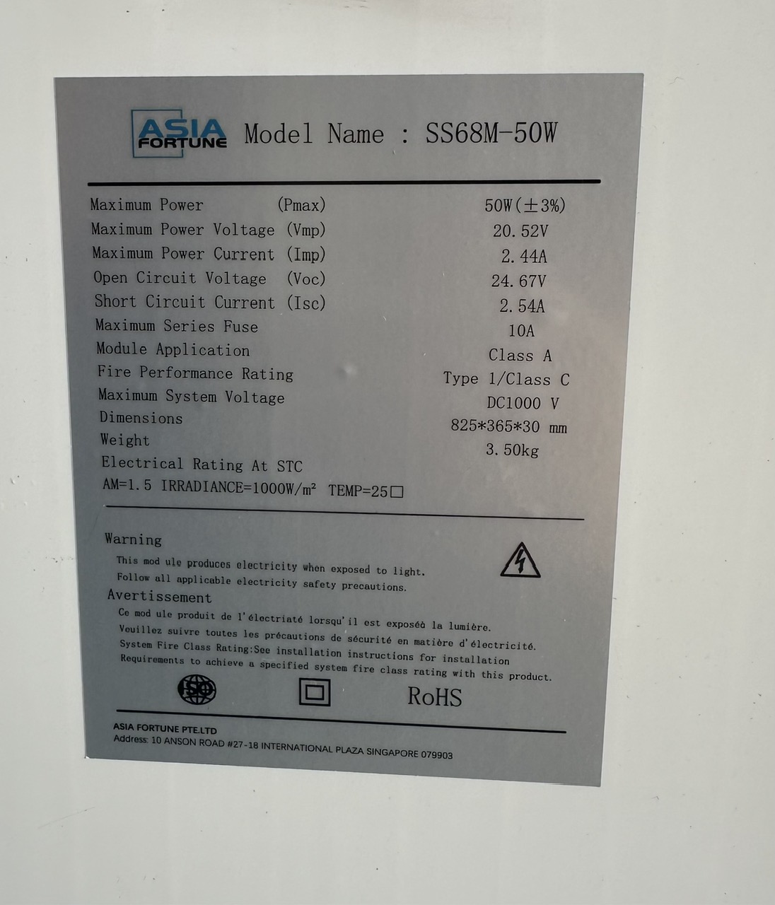Công suất mỗi tấm pin là 50W 20.52 V và có thể ghép nối các tấm lại với nhau để tăng điện áp hoặc công suất lên trong những trường hợp cần thiết.