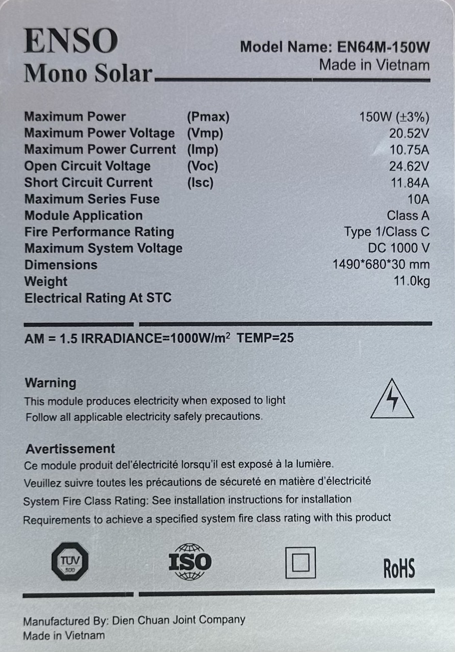 Quý khách cần tư vấn mua Tấm pin mặt trời mono 150W Enso xin vui vòng liên hệ