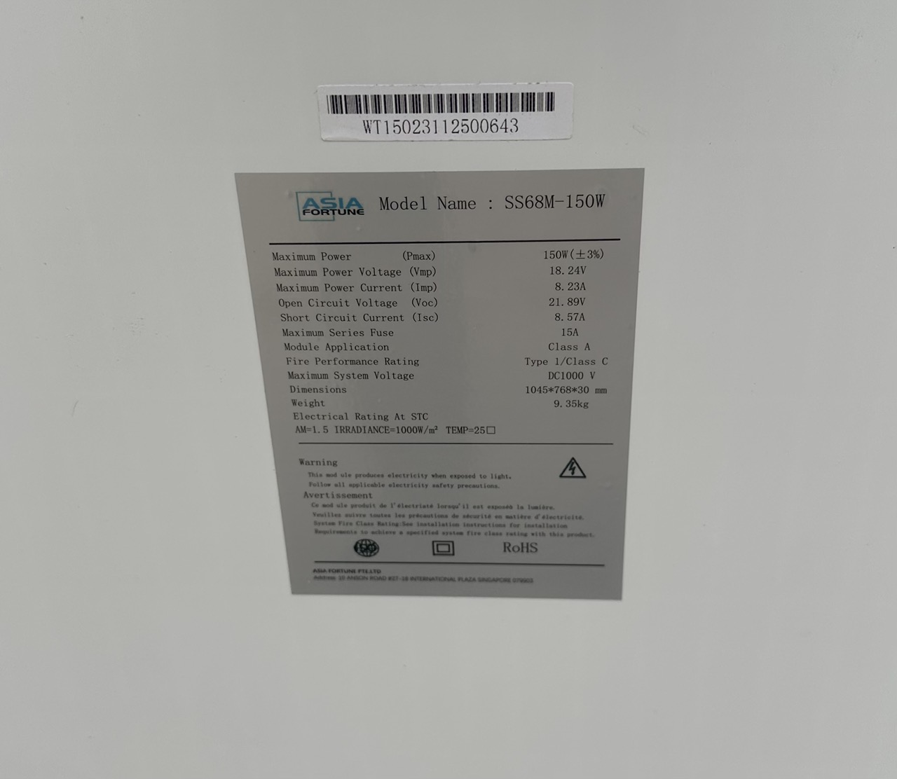 Công suất mỗi tấm pin là 150W 18.24 V và có thể ghép nối các tấm lại với nhau để tăng điện áp hoặc công suất lên trong những trường hợp cần thiết.