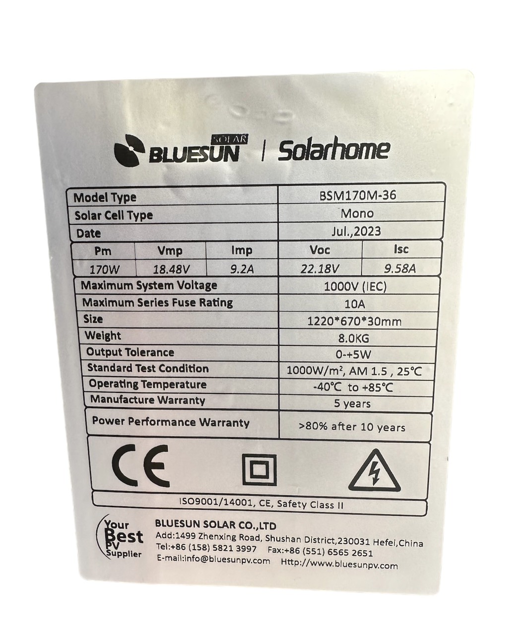 Công suất mỗi tấm pin Bluesun là 170W và có thể ghép nối các tấm lại với nhau để tăng điện áp hoặc công suất lên trong những trường hợp cần thiết.