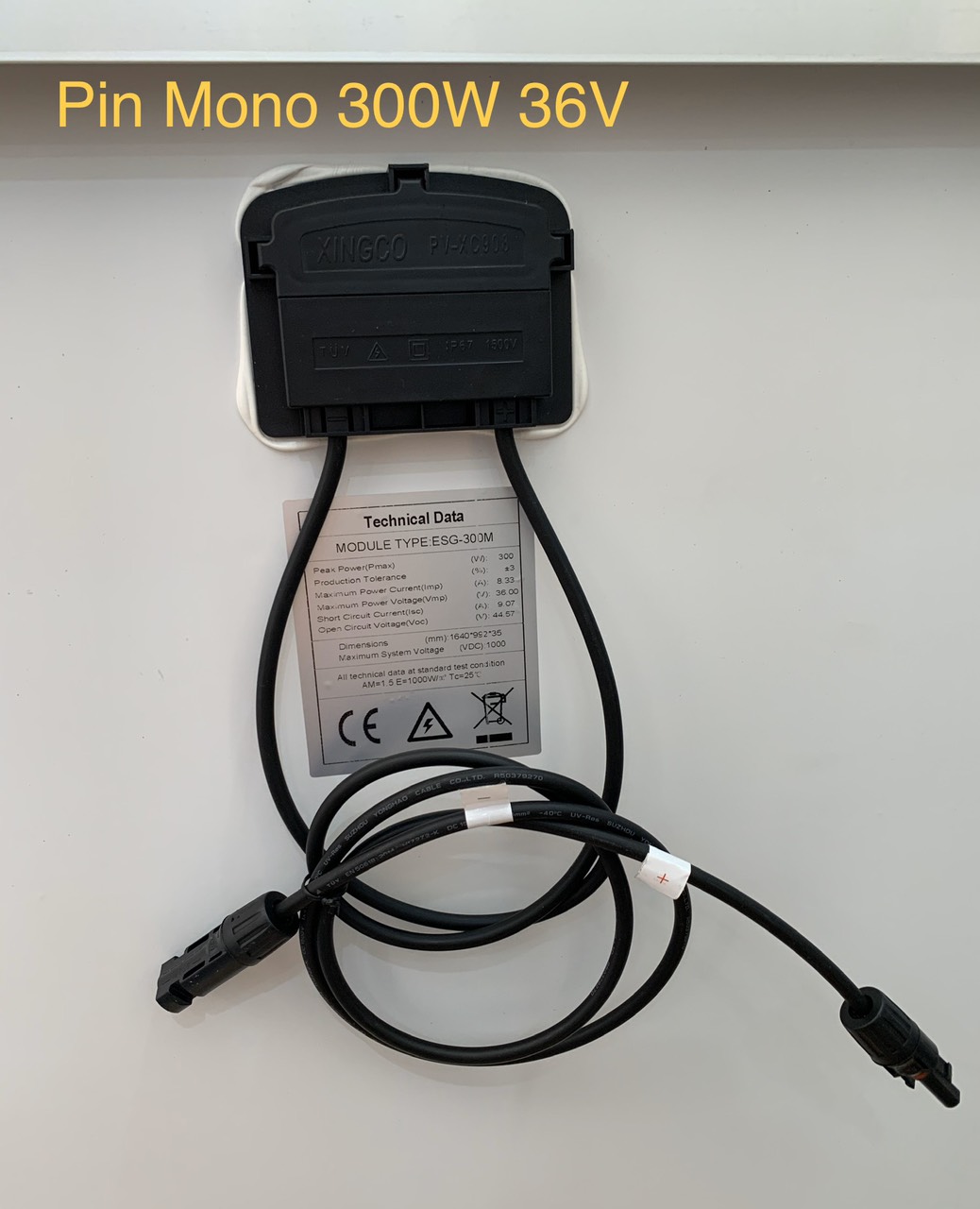 Công suất mỗi tấm pin là 300W 36V và có thể ghép nối các tấm lại với nhau để tăng điện áp hoặc công suất lên trong những trường hợp cần thiết.